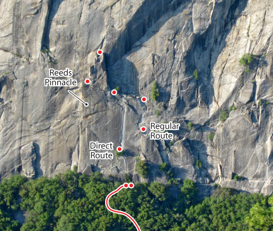 Includes Regular Route (5.9), Direct Route (5.10a), Lunatic Fringe (5.10c), Stone Groove (5.10b) and Bongs Away, Left (5.8)